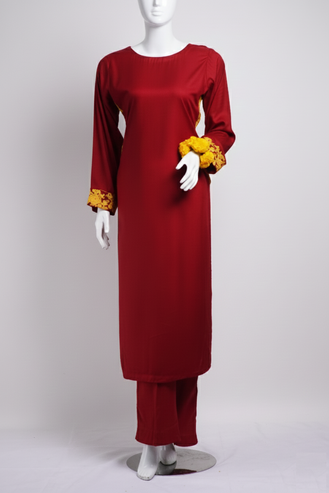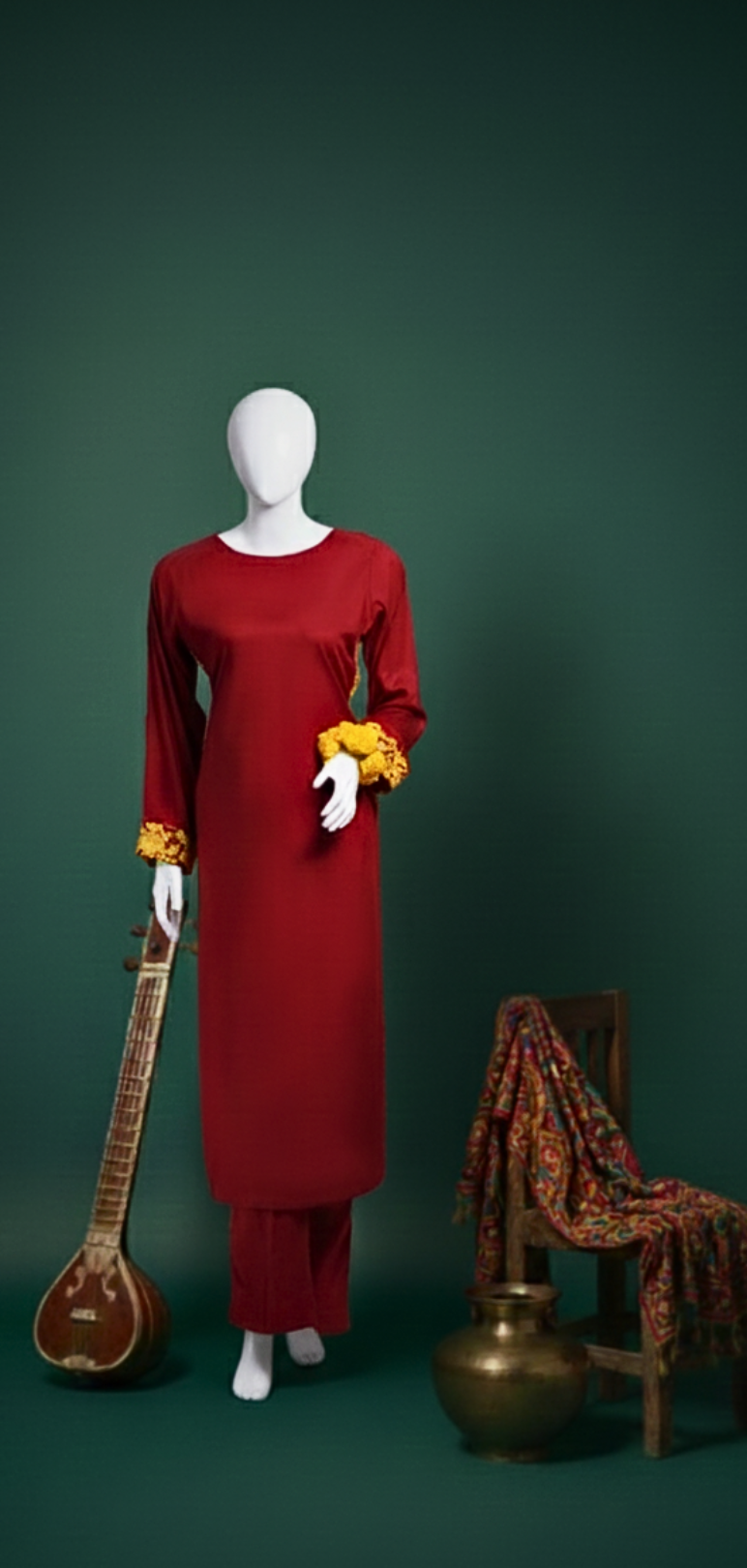 Crafted in a deep, festive red this two-piece suit captures the unparalleled vibrancy of Punjabi celebrations. While the silhouette embraces modern cuts for a sleek and comfortable fit, its soul remains deeply traditional. The true magic lies in the intricate golden yellow Phulkari embroidery that adorns the piece, a timeless craft that adds a layer of royal attraction and warmth to the iconic red base.