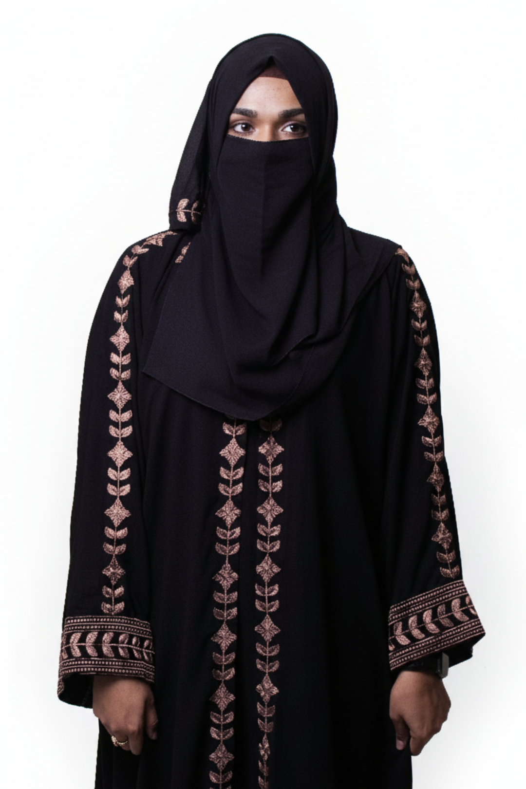 The timeless elegance of a black abaya meets the vibrant soul of Punjabi Phulkari. This piece features stunning, rich copper threadwork, showcasing the intricate culture of Punjab in a sleek, modern cut. Own a wearable piece of art that seamlessly blends tradition and contemporary modesty.